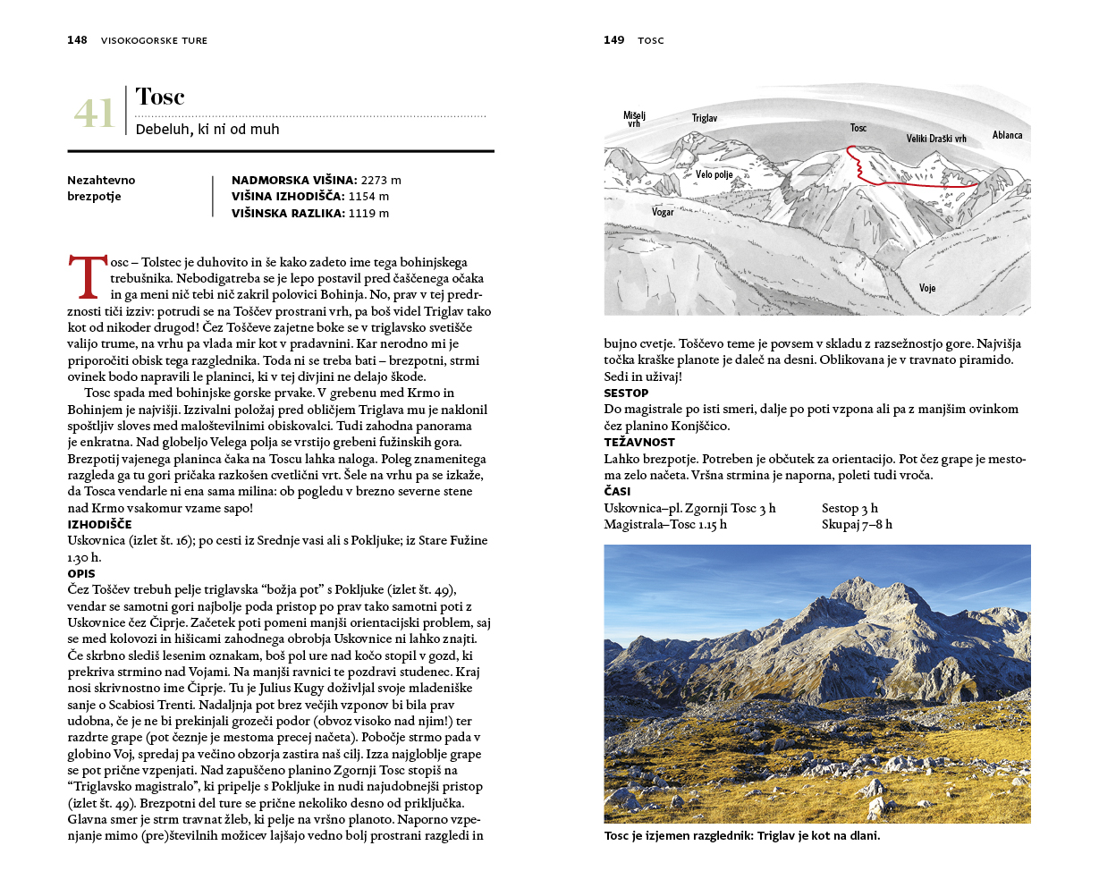 Svaka knjiga Tineta Miheliča je najbolja motivacija za odlazak u planine. Njegov inspirativni stil nezadrživo vas tjera da isti čas stavite ruskak na leđa i krenete. A što bi vam Tine mogao najbolje preporučiti ako ne svoje bohinjske planine? U Bohinju se od zadnjeg izdanja vodiča dosta toga promijenilo, povećao se broj posjetitelja, vozila i apartmana, ali gore, u visinama, tamo kamo vas Tine zove, promjena je malo ili skoro ništa. Zato Tinetove riječi zapisane prije par desetaka godina i dalje vrijede. No, naravno, svi opisi su bili provjereni i ažurirani, a ovo peto, obnovljeno i dopunjeno izdanje temeljito je osuvremenjeno. Osim toga Peter Pehani dodao je čitav niz zanimljivosti povezanih s planinarskom poviješću i običajima u bohinjskim planinama, kolijevci slovenskog planinarstva i alpske kulture.